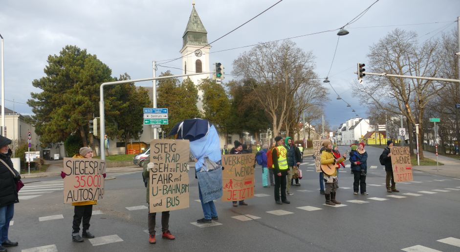 Foto: Aktion für eine Verkehrsberuhigung am Siegesplatz in Aspern „10 Minuten lang: Gesang statt Autolärm am Siegesplatz“