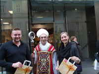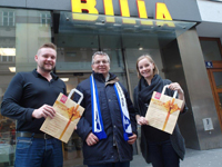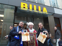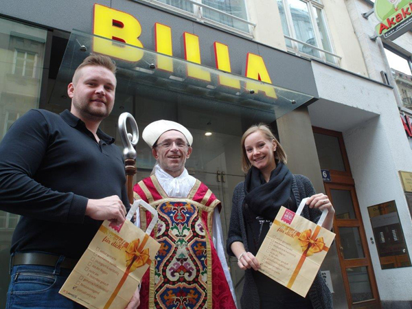 v.l.n.r.: Marktmanager Thomas Riegler vor seiner Filiale in der Singerstraße, „KA Nikolaus“ Franz Vock und Regionsmanagerin Bianca Secchi freuen sich, die MitarbeiterInnen können am 8. Dezember „Verschnaufen vom Kaufen“. Diese Ruhezone gibt Raum zum „Denken beim Schenken“.
