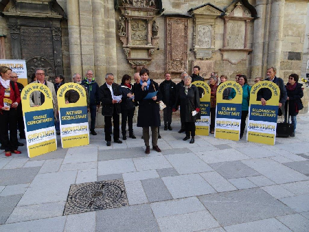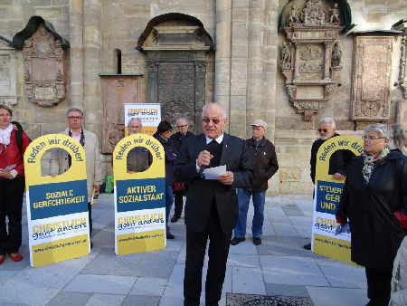 „Ein starker Sozialstaat ist möglich“, postulierte die Vorsitzende der Katholischen Frauenbewegung Österreichs, Veronika Pernsteiner: „Er ist das Ergebnis politischer Entscheidungen: für eine gerechte Umverteilung, für ein Bekenntnis zur Würde eines jeden Menschen und für seine existenzielle Absicherung unabhängig von Herkunft, Leistung und Geschlecht.“ Pernsteiner wies darauf hin, dass dort, wo der Sozialstaat in Frage gestellt, geschmälert oder gar abgebaut würde, zuvorderst die Schwächsten litten, Migranten, Flüchtlinge und Frauen, „weil Frauen ohnehin schon benachteiligt sind, als Alleinerzieherinnen, Niedrigverdienerinnen oder Zuständige für nicht entlohnte Sorgearbeit“.