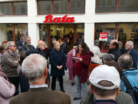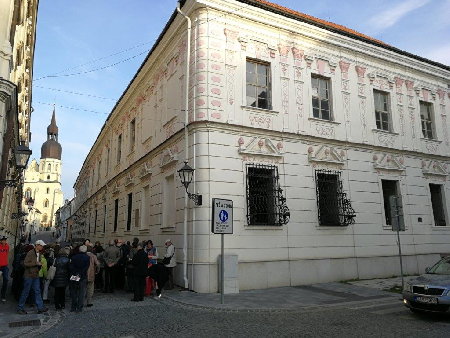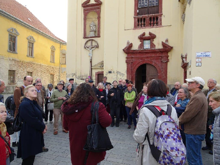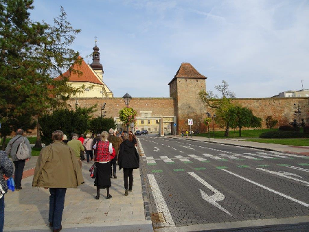 In dem im 4. Jhdt von Slowaken, im 13. von Deutschen und im 16. von Ungarn besiedelten Trnava/ Tyrnau, die anschließend abwechselnd hintereinander jeweils eine Periode regierten, wohnten 1930 noch 2700 jüdische BewohnerInnen, erzählte Kvetka Viskupicova bei der Stadtführung. Die nach Plänen des Wiener Architekten Jakob Gartner (1861–1921) in den 1890er Jahren im Historismus-Stil errichtete Synagoge ist seit 1978 ein geschütztes Kulturdenkmal. 1993 von einer Galerie erworben, finden hier seit 1995 Ausstellungen in zeitgenössischer Kunst statt. Die in den 1880er Jahren errichtete Orthodoxe Synagoge wurde bis in die 1950er Jahre für Gottesdienste genutzt, war anschließend Lager und ist seit 1978 ein geschütztes Kulturdenkmal. Nach ihrer Renovierung wurde in der ehemaligen Synagoge ein Café eingerichtet, wo auch Kulturveranstaltungen stattfinden. Heute gibt es in keinem der drei Orte mehr eine jüdische Gemeinde.