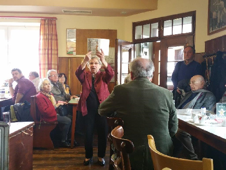 „Ich freue mich dass die 3. Generation der jüdischen Bevölkerung den Weg wieder hierher nach Kittsee findet“, sagte die pensionierte Hauptschuldirektorin Irmgard Jurkovich im Gasthaus Leban, die darauf bestanden hatte, die über 50 BesucherInnen im alten Teil des Gasthauses treffen zu können, der „zur Erinnerung“ an die jüdischen Vorbesitzer so belassen worden war. In ihrer Jugend hatte sie „nie über den Holocaust etwas gehört“. Dank eines „hervorragenden Geschichtslehrers“ und einiger anderer Umstände begann sie im Schuljahr 1981/82 mit dem ersten größeren Projekt „Dein jüdischer Nachbar“ in Kittsee die lokale jüdische Geschichte mit SchülerInnen aufzuarbeiten.