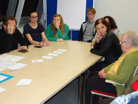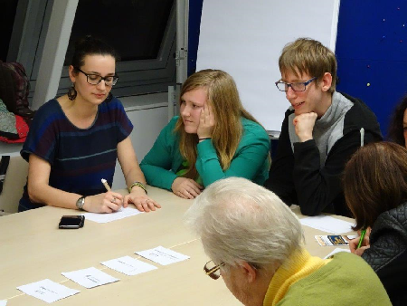 Aufgelockert wurde das Gespräch immer wieder durch „Aktionskarten“, wo positive Begriffe wie z.B. „Fürsorge“, „ Sozialstaat“ oder „Solidarität“ pantomimisch oder mit anderen zu erraten waren, „Märchenstunden“ oder durch das Kennenlernen von alternativen „So kann es auch gehen“ Modellen. Dadurch gelang es den Mitspielerinnen und Mitspielern sehr gut in einen konkreten Erfahrungsaustausch einzutreten, der gleichzeitig reale Lebensgrenzen und -nöte von Menschen sichtbar werden ließ.