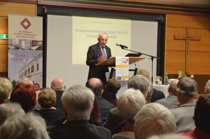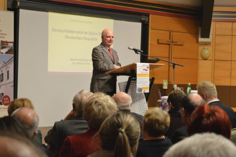 In seinem Festvortrag zum Thema „100 Jahre Republik“ erinnerte Rauchensteiner zu Beginn der Bildungs-Veranstaltung, dass neben dem eigentlichen Gründungstag am 12. November 1918 schon zuvor, am 30. Oktober 1918, in Wien die Republik „Deutsch-Österreich“ das erste Mal ausgerufen worden sei. „Der 12. November hat sich dann durchgesetzt“, betonte Rauchensteiner. Er skizzierte die letzten Jahre der Donaumonarchie, die Friedensbemühungen von Kaiser Karl und die Leistung der bedeutenden „Gründungsväter“ des verbliebenen deutschsprachigen Staatsgebiets. Der Sozialdemokrat Karl Renner etwa habe es verstanden, „die unterschiedlichen und auseinanderstrebenden Meinungen auf einen Nenner zu bringen“. Prälat Ignaz Seipel wieder habe an der „Verzichtserklärung“ von Kaiser Karl mitgewirkt und damit eine friedlich, unblutige Lösung in die Wege geleitet. Für Rauchensteiner sind daher „Renner und Seipel Väter unseres Vaterlandes“.