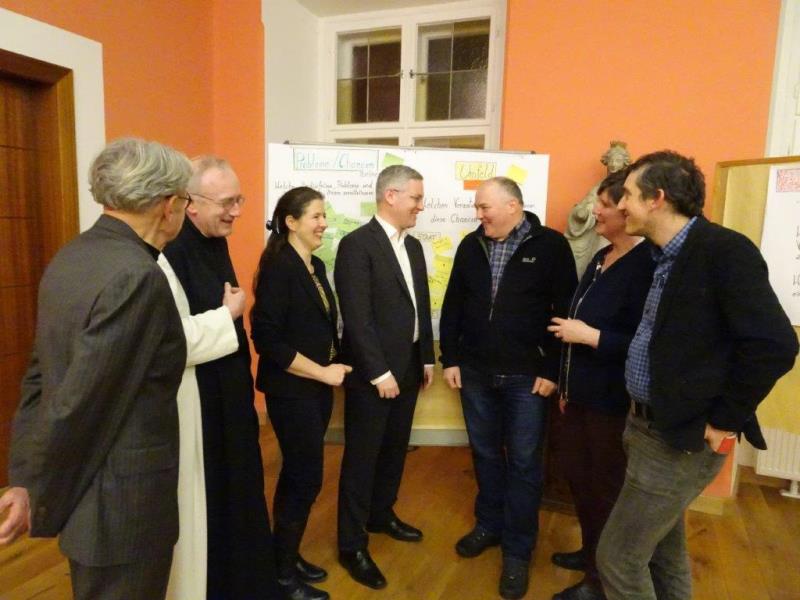 Wie praktisch erlebbar war, werden bei dem Projekt von den TeilnehmerInnen die vorhandenen Probleme benannt und das gegebene Umfeld mit seinem Wissen und Vernetzungsmöglichkeiten mit einbezogen, um gemeinsam Lösungen zu erarbeiten und so die sich bietenden Chancen nützen zu können. Neben dem Wissenschaftler Gregor Hochreiter gab der Prior des Neuklosters, P. Ludwig Walter, einen Input an dem von Heidemarie Brandstetter moderierten Abend. KA-Generalsekretär Christoph Watz und KAB-Referentin Gabriele Kienesberger wiesen auf eine Reihe von Unterstützungsangeboten der Katholischen Aktion zur Stärkung der Pfarren und des Zusammenhalts in der Region hin. Das anschließende Buffet wurde von den BesucherInnen ausgiebig zum Erfahrungsaustausch und für erste Sondierungen möglicher Einsatzorte genutzt.