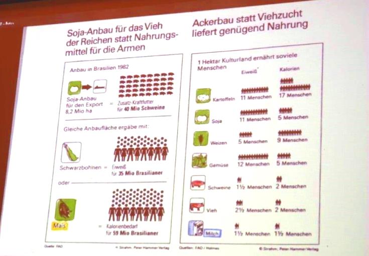 „Der Nutzflächenbedarf der Menschen steigt stark mit der Nahrung“, gab Lötsch zu bedenken. Dieser sei 680 m2/ Person in Thailand, 2300 m2 in den USA. Das führe zu „65 -70 kg Fleischverzehr pro Jahr beim Österreicher“. Auch habe sich „in den letzten 50 Jahren der Fleischkonsum verfünffacht. Zu viel an tierischem Eiweiß macht krank“. Es gebe daher heute einen „Soja-Anbau für das Vieh der Reichen statt Nahrungsmittel für die Armen“, legte Lötsch dar. So gab es einen Soja-Anbau für den Export in Brasilien 1982 auf 8,2 Millionen Hektar, was dem Zusatz-Kraftfütter für 40 Mio. Schweine entspreche. Die gleiche Anbaufläche ergäbe mit Schwarzbohnen Eiweiß für 35 Mio. Brasilianer oder bei Mais den Kalorienbedarf für 59 Mio. Brasilianern, so Lötsch.