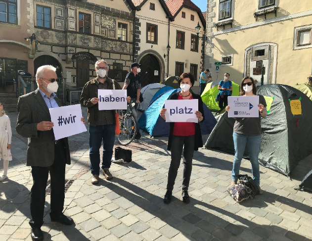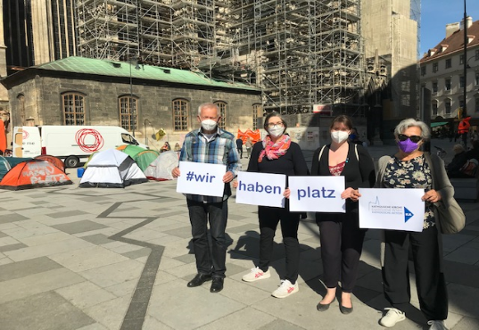 Am 8. Mai fanden am Stephansplatz in Wien und am Schrannenplatz in Mödling Protest-Camps statt, die auf die verheerende Situation in den Flüchtlingslagern in Bosnien und in Griechenland aufmerksam machten. Unter dem Slogan „Wir haben Platz“ forderten die Teilnehmer*innen – darunter auch Traude Novy und Silvia Schreyer-Richtarz von der kfb Wien, Bernhard Böhm von der Pfarre Machstraße und Vertreter vom Pfarrnetzwerk Asyl, sowie Valentina Steigerwald und Milena Müller-Schöffmann von der Kath. Aktion Wien, die Aufnahme von geflüchteten Menschen in Österreich. In zahlreichen Gemeinden unseres Landes gibt es freie Unterkünfte, die privat oder von der Gemeinde zur Verfügung stehen. Das Einzige, was fehlt, ist die Erlaubnis seitens der Politik, die notleidenden Familien aufzunehmen. Mehr Infos unter #ZusammenHalt NÖ