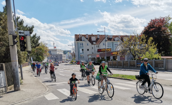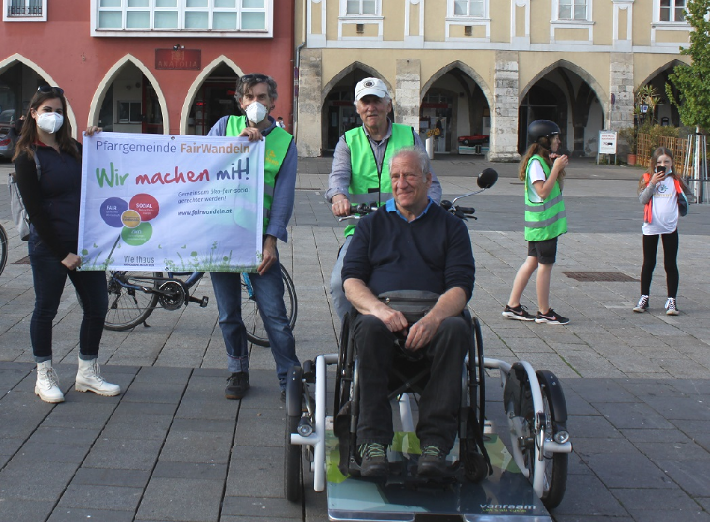 Die Initiative „Vernunft statt OstUmfahrung“ und die lokale Radlobby organisierten eine Radtour – 300 Menschen waren mit dabei auf Rädern, in Kinderradanhängern und Helmut Puritscher auf einem Rollstuhl-Fahrrad (gelenkt von Josef Worm).