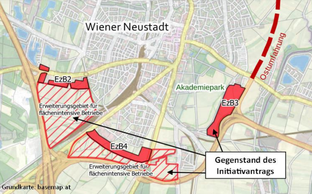 Konkret geht es im Antrag um die 37 Hektar hochwertigen Ackerboden östlich des Akademieparks. Diese Fläche soll nach den Plänen der Stadt als Gewerbegebiet verbaut werden. Dieses Vorhaben fügt sich ein in die umstrittenen Straßenprojekte „Ostumfahrung“ (ein Projekt des Landes NÖ, gegen das bereits 5000 Menschen unterschrieben haben) und dem Ausbau der S4 (ein ASFINAG-Projekt), die beide dazu dienen mehr Verkehr in die Stadt und zu neuen Gewerbegebieten zu bringen. Im Süden und Westen von Wiener Neustadt sind weitere 200 Hektar langfristig als „Erweiterungsgebiete für flächenintensive Betriebe“ vorgesehen. All diese unverhältnismäßig großen neuen Gewerbegebiete dürften die Kommunalsteuern heben, allerdings nur auf Kosten der Lebensqualität in Wiener Neustadt.