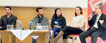 Aus ihrer eigenen Flüchtlingserfahrung berichteten die Betroffenen (v.l.n.r.): Mir Jahangir, Alireza Daryanavard, Parvin Razavi, Rama Hedo und Manuel Baghdi. Foto: Nikolaus Stockert