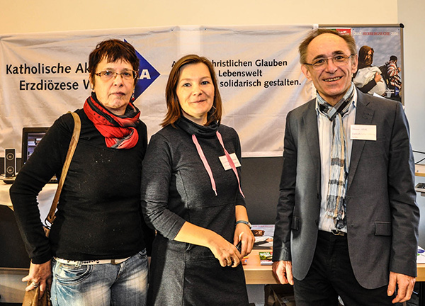 Beim KA-Stand der Integrationsausstellung konnten sich die BesucherInnen über die verschiedenen Integrationsangebote der KA wie www.jobbegleitung.at informieren, den Interreligiösen SOL-Wandkalender erwerben, oder auch den praktischen Jungschar Trolley näher begutachten bzw. ausborgen. Er enthält einen Materialkoffer mit Spielen-Material, Bastelanleitungen ohne komplizierte Erklärungen und ohne große sprachliche Anforderungen sowie einen Deutschkurs. Von vielen wurde der Folder „Was Christinnen und Christen über den Islam wissen sollten“ mitgenommen oder auch der dazugehörige Quiz. Auch der von der KA-Mitarbeiterin Silvia Schreyer-Richtarz gedrehte Film „Ich war fremd und ihr habt mich aufgenommen“ (http://www.ka-wien.at/site/themen/tv/dokumentationen/article/1592.html) mit seinem wertvollen Einblick in die Integrationserfahrungen verschiedener Pfarren wurde immer wieder interessiert angeklickt.